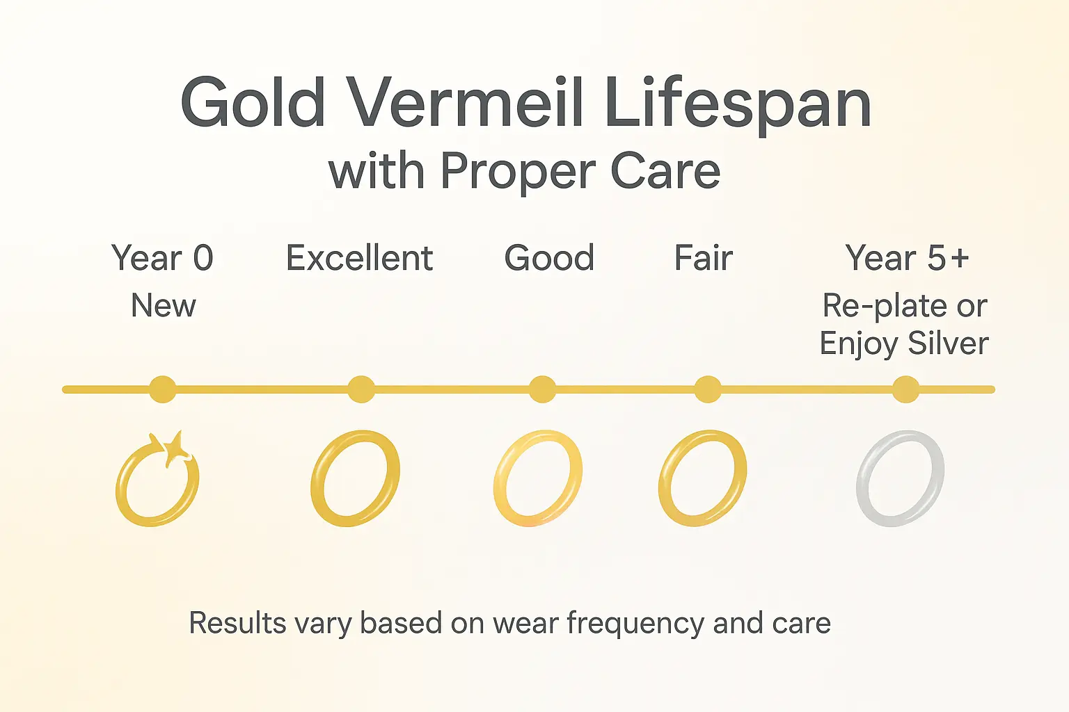 With proper care and moderate wear, quality gold vermeil jewelry typically maintains its beautiful gold appearance for two to five years. Some pieces last longer; others show wear sooner. This range reflects real-world usage—vermeil isn’t engineered in a laboratory under controlled conditions. It’s worn by real people with varied lifestyles, care habits, and wearing patterns.