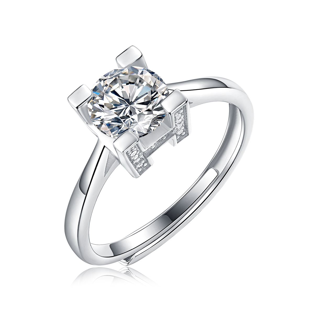 925 Silver Round Moissanite Engagement Ring – Modern Four-Prong Setting, Adjustable Band for Women’s Gift