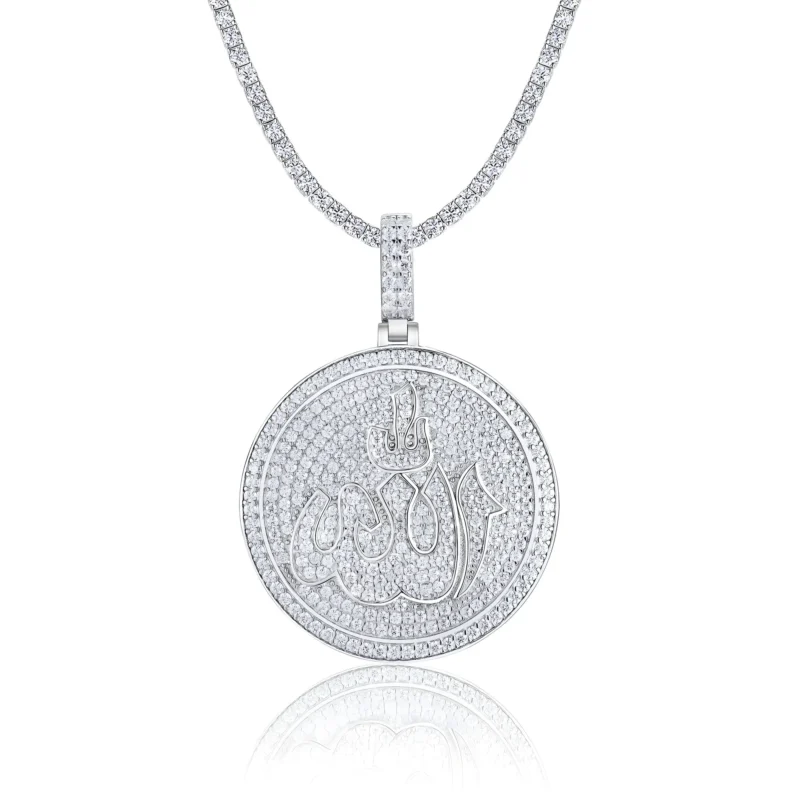 🕌 Honor divine elegance with our Iced Out Pavé Moissanite ‘Allah’ Calligraphy Medallion Pendant, where sacred Arabic artistry meets brilliant craftsmanship through traditional calligraphy design that creates spiritual brilliance combined with expertly-arranged moissanite pavé setting and classic medallion construction. This reverent piece showcases spiritual jewelry artistry through intricate calligraphic detailing and circular pendant framework, creating devotional accessories that celebrate both Islamic tradition and pavé-enhanced crystalline beauty in sacred displays.