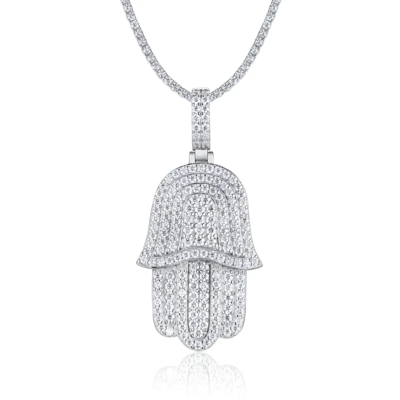 🧿 Embrace divine protection with our Iced Out Pavé Moissanite Hamsa Hand Pendant with Tennis Chain Necklace, where sacred Middle Eastern symbolism meets comprehensive pavé luxury through complete stone coverage that creates spiritual brilliance combined with meticulously-set moissanite pavé design and classic tennis chain foundation. This protective piece showcases spiritual jewelry mastery through densely packed pavé presentation and sacred pendant positioning, creating meaningful accessories that celebrate both protective symbolism concepts and pavé-enhanced crystalline protection in sparkling chain displays.
