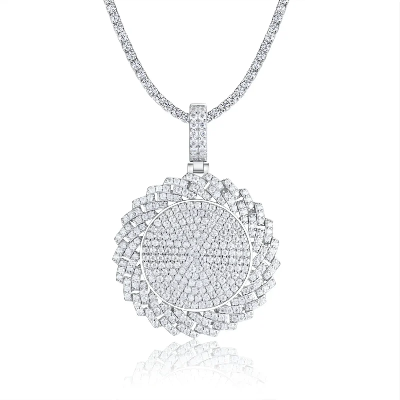 🏅 Command attention with our Iced Out Spinning Baguette and Pavé Moissanite Medallion Pendant, where dynamic motion meets luxury craftsmanship through innovative spinning mechanism that creates kinetic brilliance combined with expertly-arranged baguette and pavé moissanite medallion design. This interactive piece showcases mechanical jewelry mastery through densely packed stone presentation and rotating medallion positioning, creating dynamic accessories that celebrate both kinetic innovation concepts and mixed-cut crystalline movement in sophisticated displays.
